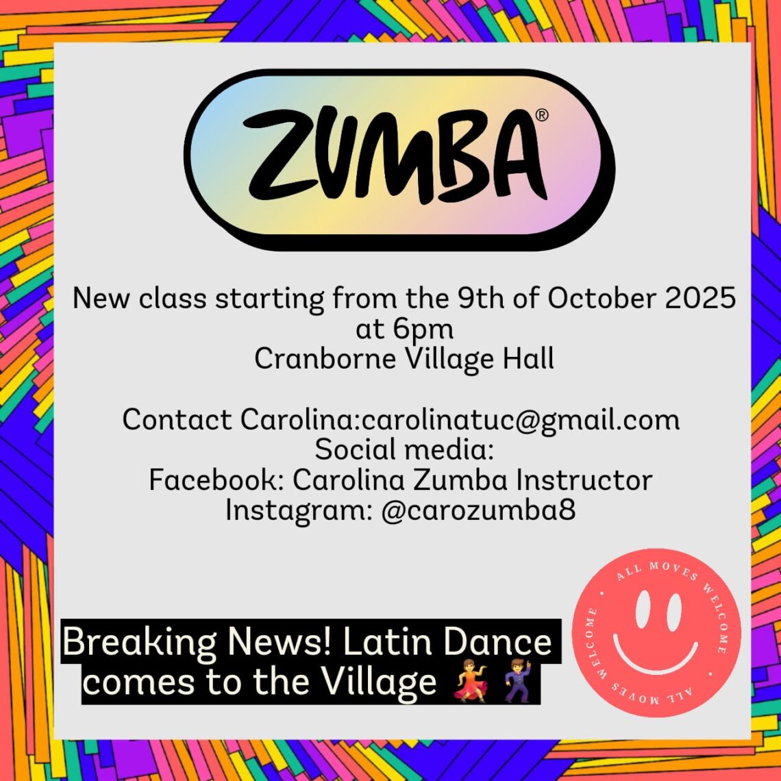 Zumba is coming to Cranborne village hall! It’s going to be every Thursday at 6pm, starting on October 9th.
